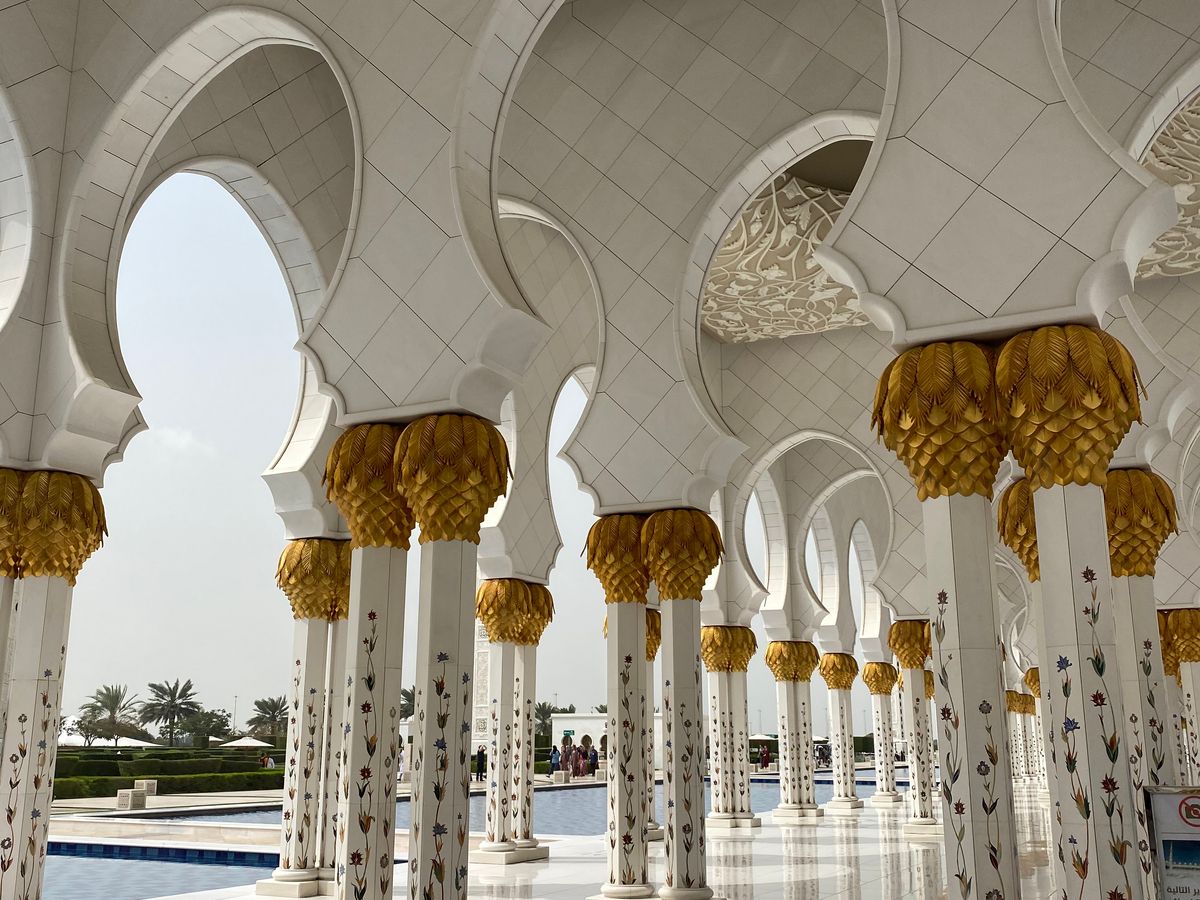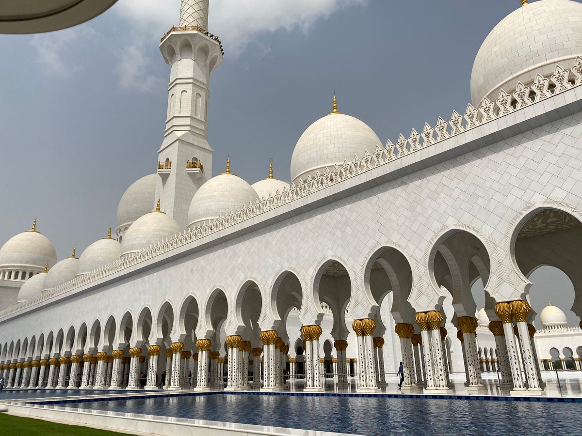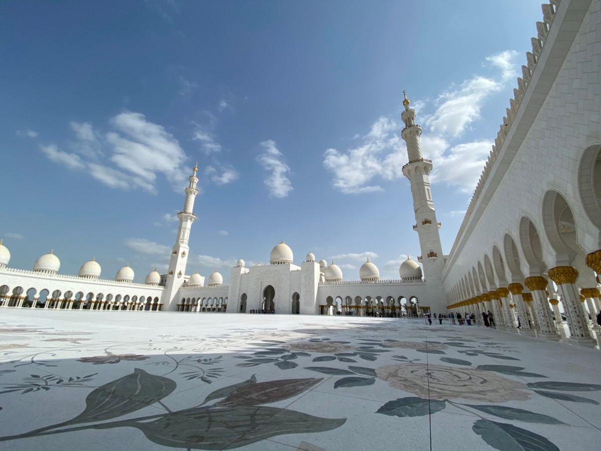 シェイクザイードモスクは、どこから写真を撮っても映えて、本当に素敵でした。ガイドさんも何回も来たことあるそうですが、その中でもトップレベルの快晴具合で、青い空に白いモスクが本当に綺麗とおっしゃっていました。