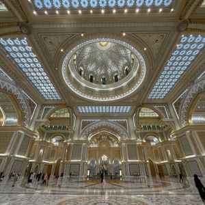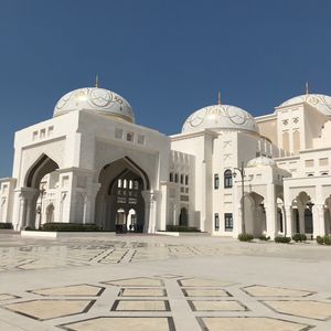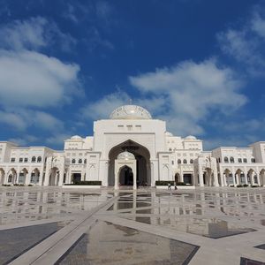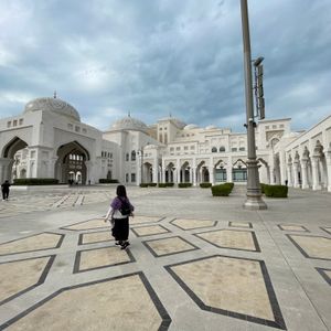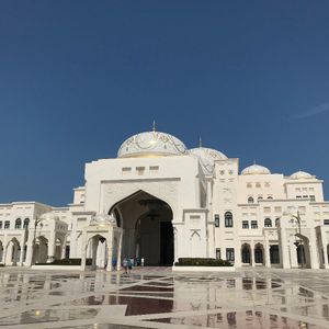 グランドモスクが一番の目的でしたが、午前中のカスールアルワタンでも度肝を抜く豪華さにため息出まくりでした。エントランスの前から見た宮殿は本当に美しく、青空に映えて最高にきれいでした。