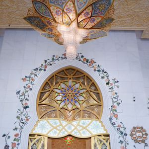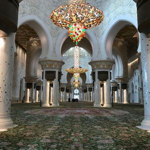 グランド・モスクでは女性は肌や体のラインが見えない服装、頭髪を隠すショールの準備が必要ですが施設の豪奢な内装でした