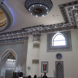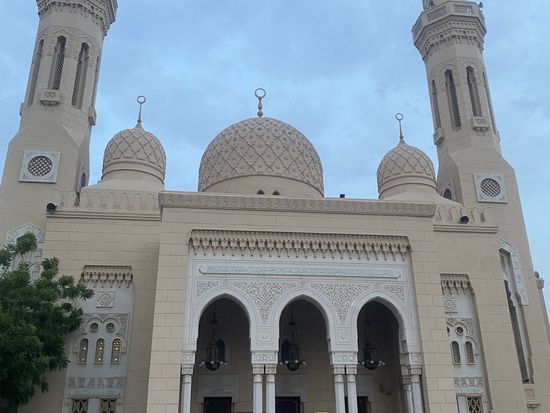 始めは複数の車ごとにアル・ファルーク・オマール・ビン・アル・カタブ・モスクに集合となった。そこでツアー参加者は合流することになった。中東圏のモスクを見学する際は厳しく、露出度の低い服装で内と内部を見学することができない。万が一露出度が高い服装を着用している場合は、レンタル衣装を着用することになるが、着替え等により見学時間が短くなるので、注意が必要である。内部は簡素な造りではあるが、豪華な装飾品が飾られていた。モスクの内部を見学するのは貴重な体験であった。