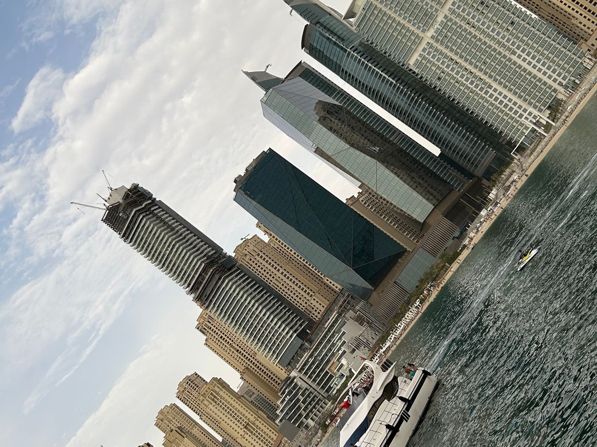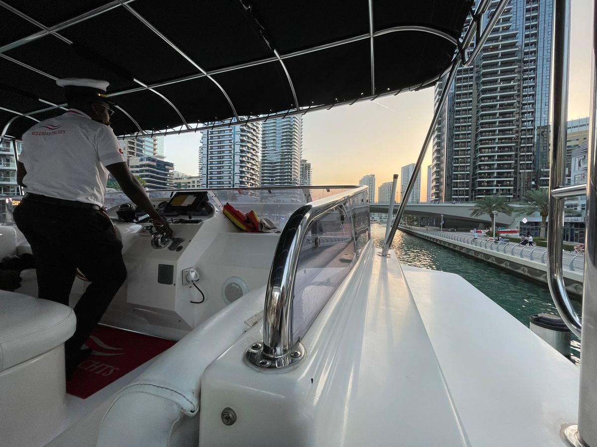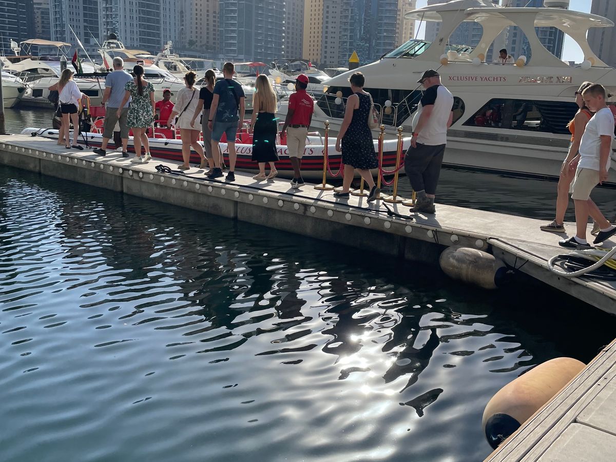 ドバイマリーナでぶらぶらした後、時間になったので外にある窓口でチェックイン。黄色いボートがあったので場所もわかりやすかったです。ツアーがスタートすると、最初の30分はゆっくりマリーナ内を進みます。マリーナはどんどん新しい建物がたつそうで、右に左にここだけでも見所たくさんです。沖に出るとスピードアップし、ドバイの綺麗な海を進みます。各写真スポットでは、スタッフさんが前の席から順にボートの前に呼んで写真を撮ってくれます(強制ではないので、断っている方もいました)。自分達だけの素敵な写真を撮れるのでおすすめです♪ツアー前後は気持ち良いマリーナをお散歩したり、ショッピングモールで買い物したり出来るので、便利なロケーションでした。一点、周りの道は渋滞していたので、時間には余裕を持って向かうことをお勧めします。
