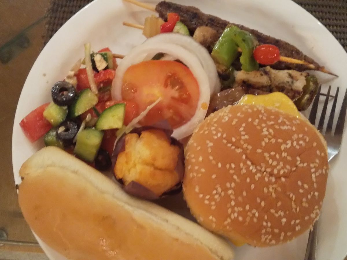 1時間くらいたつとお食事の時間。船の後方で調理されていたソーセージ、船内の調理場でスタッフさんが準備してくれたサラダやマフィン、ハンバーガーを食べられます。