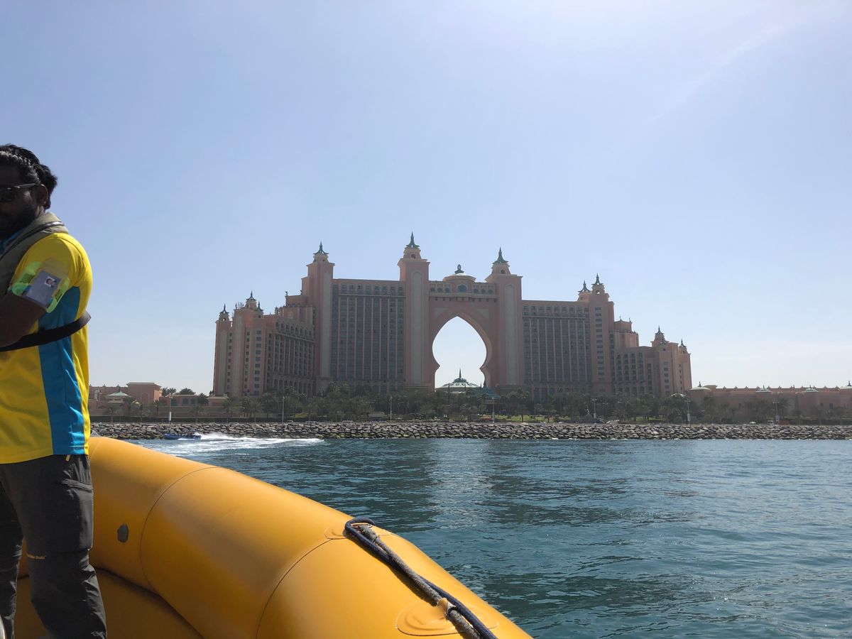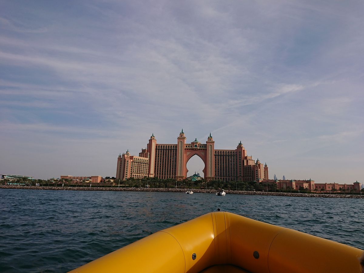 ボートはドバイマリーナから乗合い船にのってドバイパームジュメイラの方まで高速で行きました、スリル満点でアトランティスホテルの海上で写真をとりました。