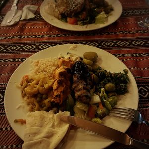 別の会社(Orient tours)が催行する砂漠の中のキャンプサイトへ移動してのダンス鑑賞(ベリーダンス等)及び夕食(BBQ:スタッフさんが当日焼いてくれたお肉ビーフパテ、ラムチョップ、マトン、チキン、サラダ等など)、食事は大人は食べれるが小学生以下のお子さんには少し食べづらいかと思います。事実、うちの子どもはほとんど食べてませんでした。