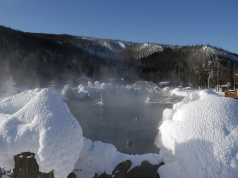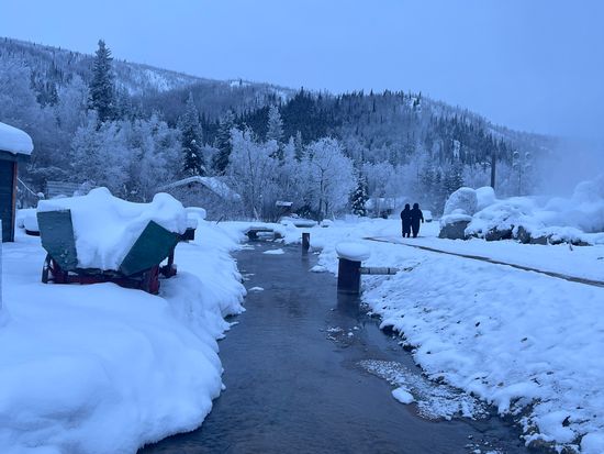 フェアバンクスから車で1時間半ほどのところにあり、約100年前から営業している温泉リゾート地です。周りは豊かな緑に囲まれており、水着を着て入ります。重炭酸塩ナトリウム、硫酸塩、塩素などが含まれておりリュウマチや冷え性などに効能があります。日中に温泉に入れば、夜までポカポカの身体のままオーロラ鑑賞に出かけることも可能です!