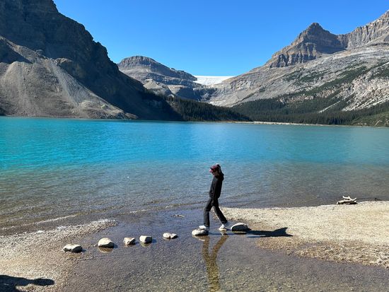 標高1,900mのところにある氷河湖。バンフとキャンモアの町を流れるボウ川の水源でもあります。広々とした湖の向こうには氷河をまとった険しい山々が見渡せます。