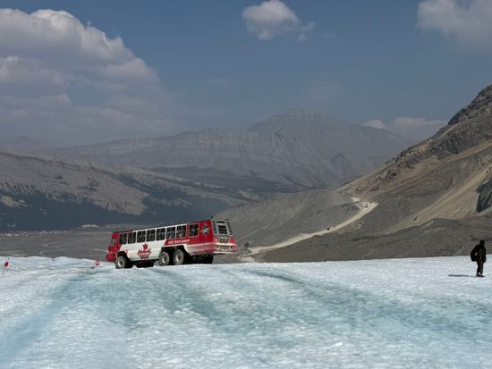 北極圏以南で世界最大の氷原とされるコロンビア大氷原。そこから流れ出たアサバスカ氷河の上を雪上車で観光します。