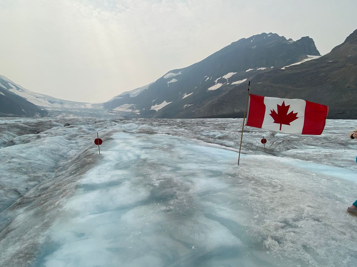 熱い日本を飛び出してバンフへ、風が山から谷へ吹いているので8月とは思えないほどの冷たい風が吹き抜けていきます。雪上車に揺られること15分ぐらいかな、氷河の大地につきます。ものすごく寒くてでも景色は最高でした。
