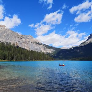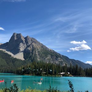 ⑦ エメラルドレイクではカヌー体験を 70ドルでできます。 是非した方がいいです。 陸から見る様子と湖の上から見る様子は違っていました。 カヌー体験すれば 両方楽しめます。 また、他の湖だと100ドル以上します。 1隻に3人まで乗れます。 オーナーが後ろに乗ります。向かい合って漕げませんが、ある程度こいでから、向かい合って カヌーの上でおにぎりを食べました。 自分たちの前に並んでいた中国人の大家族が、1席に3人という説明を理解していなかったのか、乗る段階になって四人で乗せろとずっとごねていてすごく時間がかかっていました。 私たちの前に並んだ2人組が、時間がかかるその人達よりも先に通してもらえたので、続いて一緒に行ったら、中国人が3人ずつでいいと納得し、時間をかけて、私たちより先に乗りました。私たちはしばらくほったらかしにされていました。 だいぶ待たされるなと変だと思い、係の人に言うと、慌てて出発させてくれました。前でいろいろごねた中国人大家族のせいで、 私たちもその一部で、ただ見送りに来たと思われていたようです。 1時間しか借りれないので (ツアーの自由時間も1時間しかありません )時間がないのでおかしいと思ったら急かした方がいいです。
