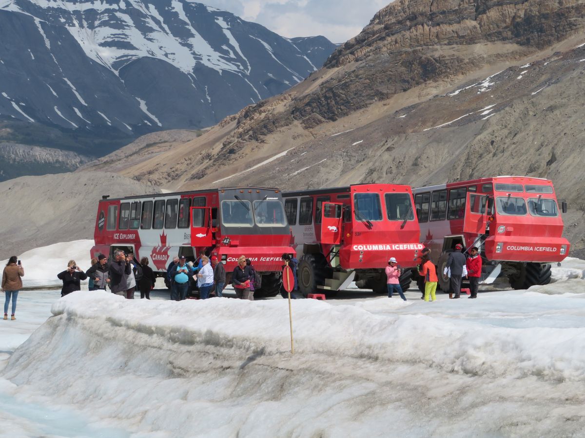 コロンビア大氷原は、雪上車に乗り換えて行きました。氷河の上を歩けて氷河の水も少し飲めて貴重な体験でした。あまり風がない日で、それほど寒くなかったです。