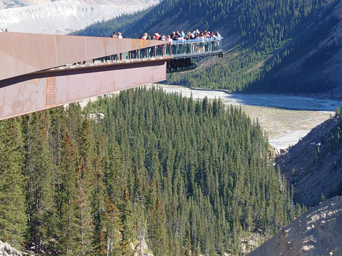 スカイウォークは氷河からバスで10分程度移動、ガラス張りは最先端の場所のみなので避けることも可能、高所が苦手な人でも楽しめる