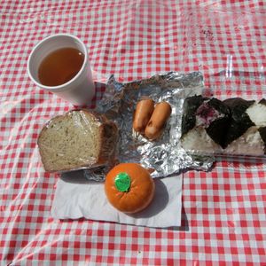 ランチは手作りおにぎり2個、ウィンナー、パンケーキ、ミカン、お茶を見晴らしの良い丘の上で食べました。
