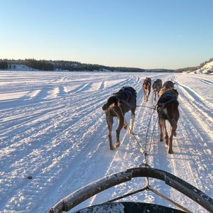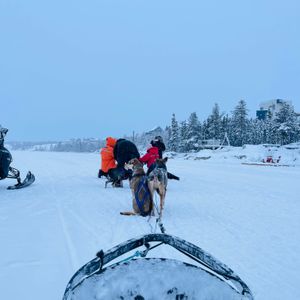 真っ白な雪原(凍った湖の上です)を5,6匹のわんちゃんに引かれてとても気持ちよかったです。
