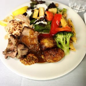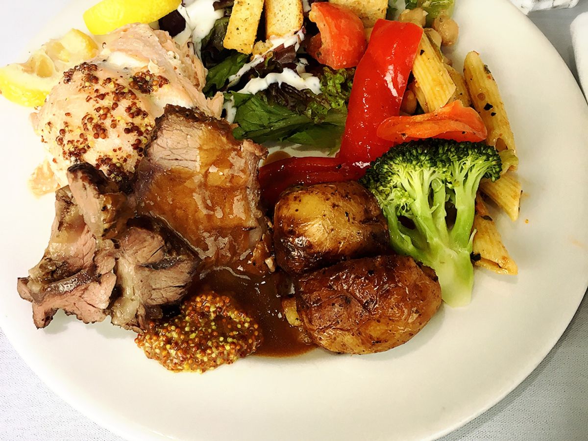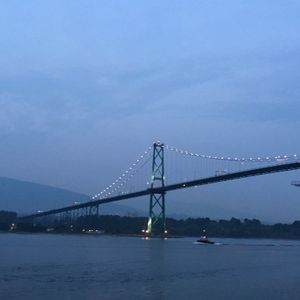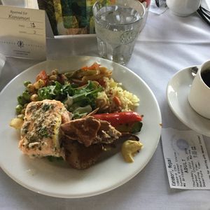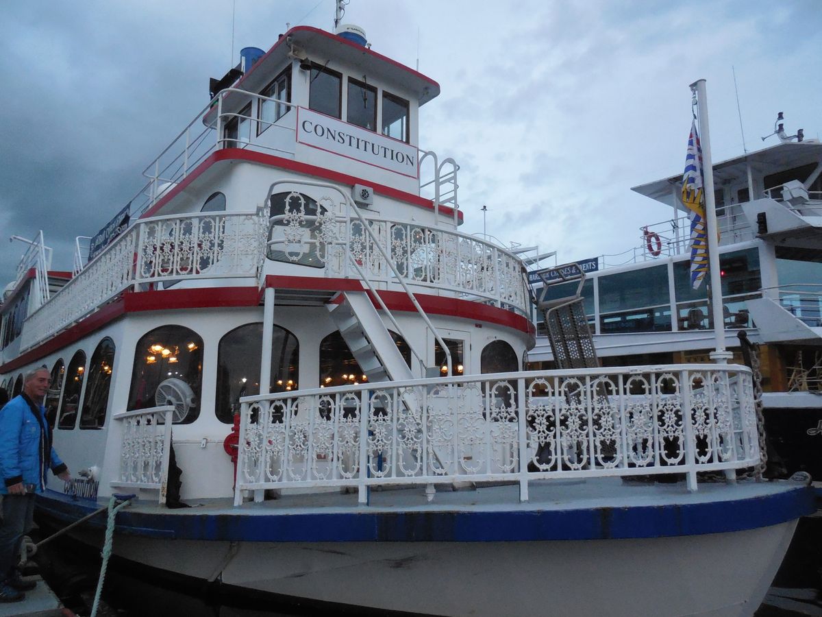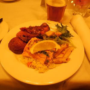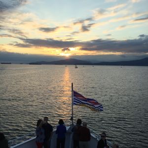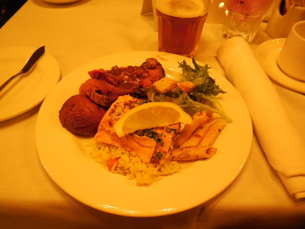 観光客だけでなく、地元の方が誕生日記念に乗船(2組)していたようで、親しまれているクルーズだと思います。6時半集合、7時出航のため、ぎりぎりの人もちらほら。出航後間もなく、ソロの生演奏とスタンダートナンバーが始まり、アルコールは有料でしたが、BC産ワインもお手頃でした。隣のカナダ人夫婦にチップはアルコール代の払いでいいと習い、安心できました。食事(ブッフェ)に順番に案内があり、しっとりとしたスチームサーモンに暖かなローストビーフは切りたて。美味しく、サービスも良かったです。おかわりもOKだったようです。