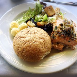 ランチメニューはサラダとサーモンあるいはチキンにデザートのケーキのみで内容的には