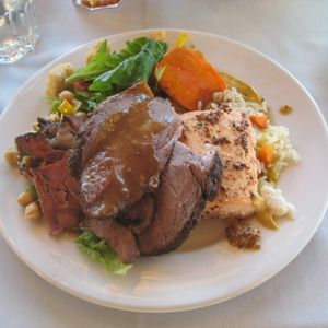 ビュッフェ形式のディナーは品数はそこまで多くないですが、どの料理も非常に美味しく、食事だけでも十分楽しめると思います。直径25センチ程度の大皿に盛るよう言われ、多くの参加者が皿いっぱい山盛りにしてテーブルまで戻っていました。大皿1枚分と別皿でデザートのケーキを2切れ程食べてお腹いっぱいになる感じです。なお、酒類は別料金で9-15ドル程度、紅茶とコーヒーは無料です。