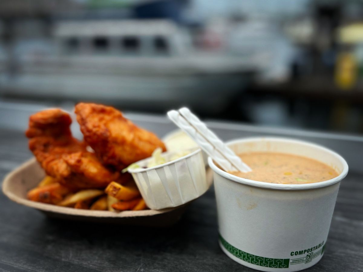 フィッシュ&チップスはタラが定番だが、オヒョウが美味しいと聞いていたので、オヒョウにチャレンジ。クラムチャウダーもこの店のオリジナルで、少しオレンジがかった色味で、スパイシーで独特の味わいがクセになる。具もたっぷりで、ココナッツフレーバーが加わり、他にはない風味が楽しめた。とても美味しかった。