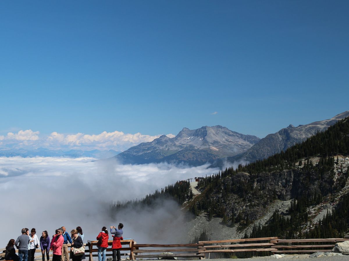 ウィスラーまで約2時間の途中、シャノン滝にも寄りヴィレッジ到着時は曇り空、この日はマウンテンバイクの国際大会もありガイドさんの案内でわずかでしたが見学もできました。山頂に向かうリフトを乗り継ぎあと少しのところで雲の上に!中腹より上は雲で見えていませんでしたが、雲の上は快晴の青空が広がり、眼下は雲海、目の前には氷河や万年雪の山々がパノラマとなって現れ感激、さらには展望エリアには野生のマーモットが数匹、間近で草を食む様子を見ることができました(かなり珍しいことのようです)。PEAK 2 PEAKキャビンも雲海の上下を進みまさに貴重な体験ができました。山頂散策もリフトでさらに頂上へに、360度の絶景を楽しむことができました。