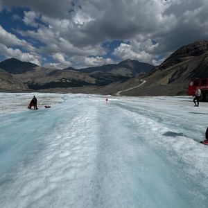 コロンビア大氷原は氷の上を歩くので靴に気を付けたいところです。同グループで滑って大きくコケている方がいらしゃったり、妻も何度もスリップしながら靴の中をビショビショにしていました。ゴアテックスのハイキングシューズレベルで行った方が良いです。