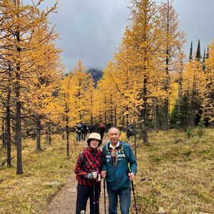 当日、ホテルへ来て頂き我家2人とガイドさんの3人での山登り、行先は黄葉の真っ只中をモレーン湖から案内していたたけました。速度も、休み休み行かないと、2000m級の所を行けません。標高差500m程、途中、雨が降り降りましたが、綺麗な所でした。