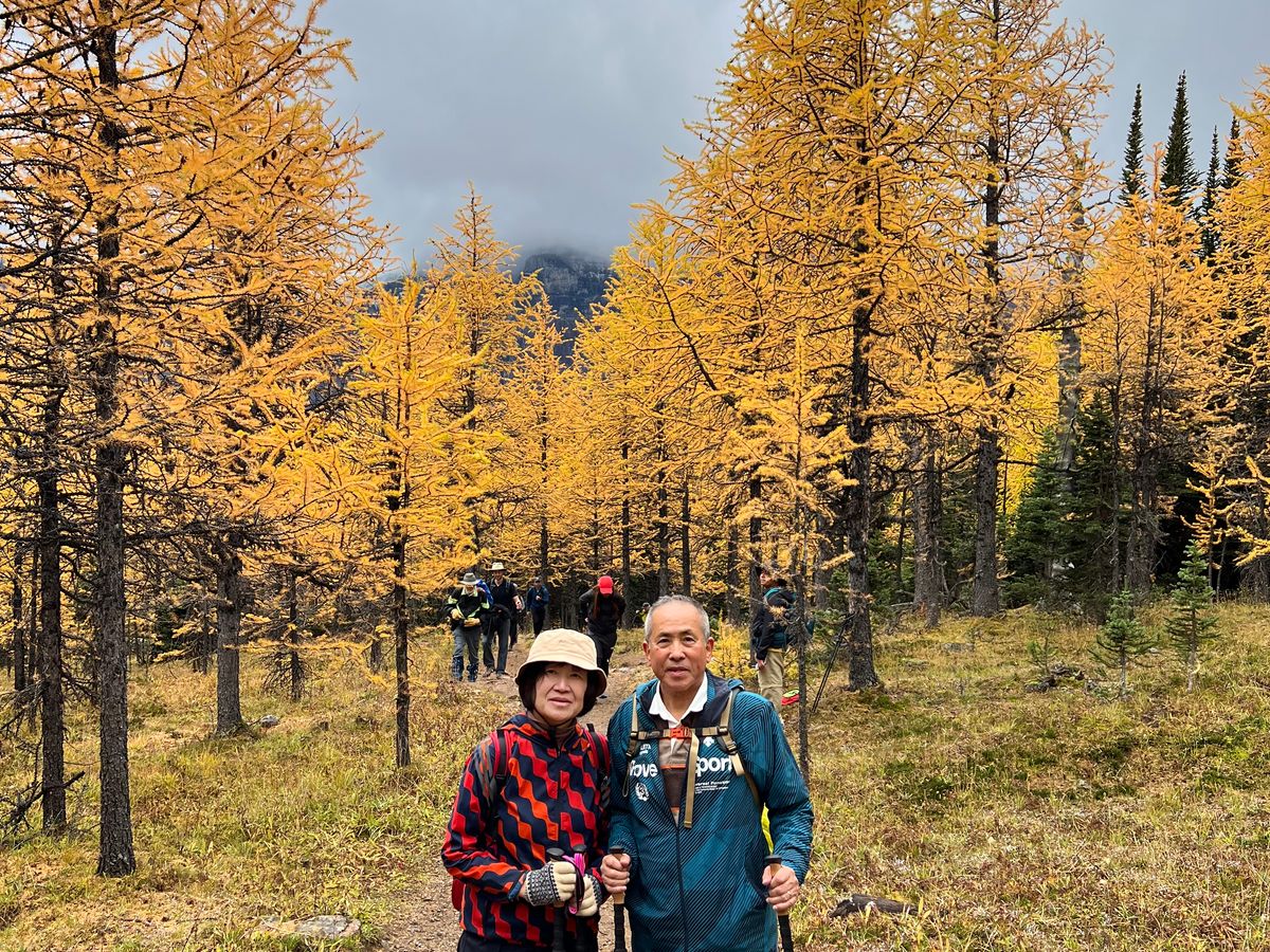 当日、ホテルへ来て頂き我家2人とガイドさんの3人での山登り、行先は黄葉の真っ只中をモレーン湖から案内していたたけました。速度も、休み休み行かないと、2000m級の所を行けません。標高差500m程、途中、雨が降り降りましたが、綺麗な所でした。