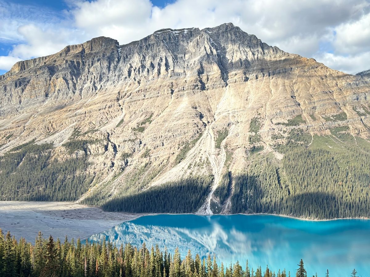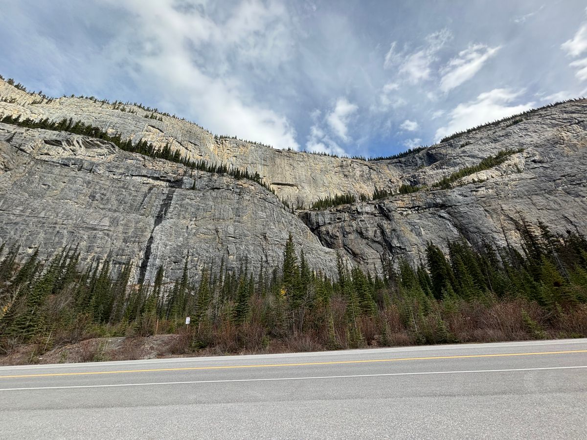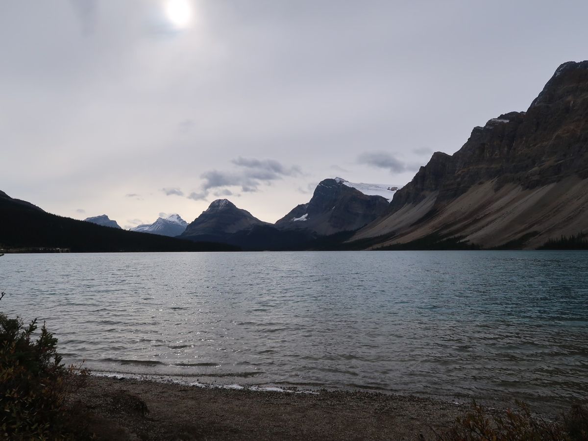 薄く雪化粧した複雑な断層で形作られた雄大な山々、薄いエメラルドグリーンの透き通ったボウ川、黄色く色付いた木々、目に入るもの全てが素敵な道程でした。特に山々が湖面に鏡のように映る光景は目を奪われる感動的なものでした。壮大なバンフ国立公園の魅力を堪能できる良いツアーだと思います。我々は2日間に分けてたくさんの湖や滝や氷河を回りましたが、体力のある方なら1日で回るのもアリだと思います。でも、例えばナチュラルブリッジは素晴らしいですが、2日間でないと行けないです。