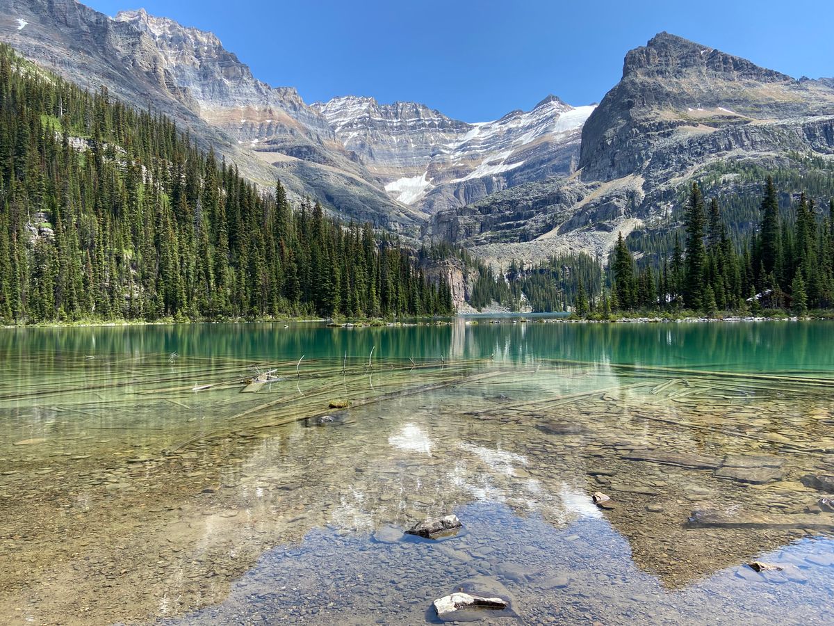 このツアーは入場制限があり、今回滑り込みで取れたのも幸運だったし、天気も雲ひとつない晴天、気温も低すぎず、快適でした。なのでこのレビューを参考にしてしまうと、天候に恵まれなかった場合にがっかりする方もいるかもしれませんが、氷河の量は年々減少していますから、もしカナディアンロッキーに来られるなら、レイクオハラツアーに来れるだけでもラッキーです!