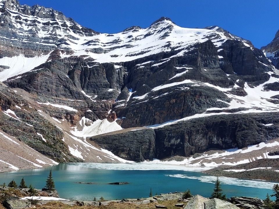 行く道々めずらしい高山植物の数々、そして上の湖から流れ落ちてできる目の前に迫り来る滝、あちらこちらに出没する小リス達。途中何度も休憩しながらいよいよレイクオエサに到着すると、そこには氷河が湖面に浮かんで目の前の山にもまだまだ雪が残っていて、ここでしか見ることのできない景色に主人共々感動の極みでした。とても貴重な体験をさせて頂き、ありがとうございました。