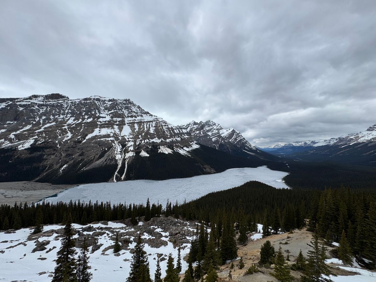 レイクルイーズに宿泊し翌日参加、バンフで解散しました。モレーン湖は上から眺めるスタイルで、遠くの山や空と湖の青が鮮やかでした。途中雪もチラついたり晴れたりと天候は今ひとつでしたが、それも楽しい体験でした。ヨーホー国立公園など移動に車が必須な場所を効率よく観光することができるツアーだと思います。