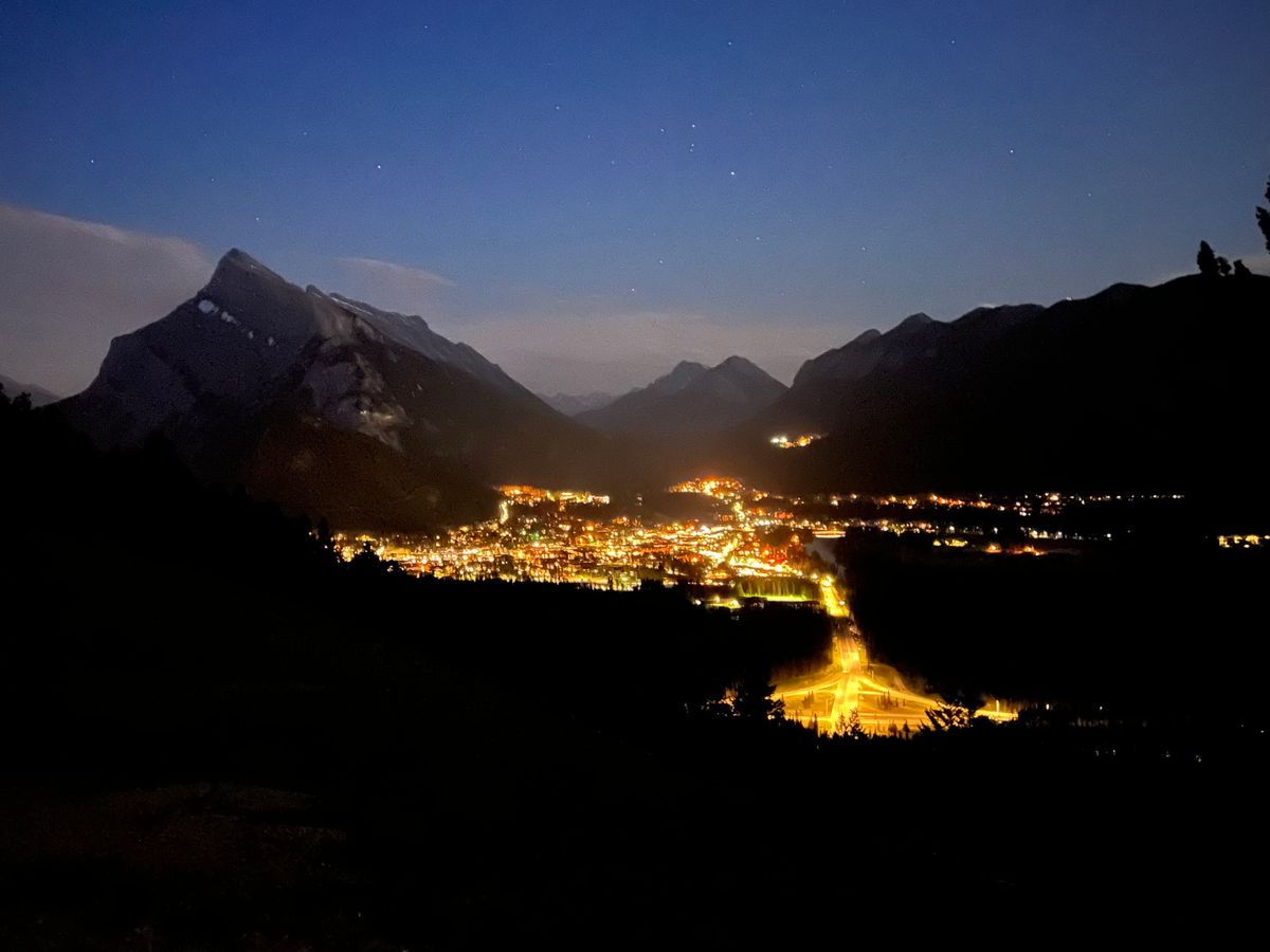 次に行った裏山の展望台では、バンフの町全体の夜景を見渡すことができました。これまで見てきた町の風景と重なり、とても良い場所でした。先程のホテルやゴンドラの場所も分かりやすかったです。
