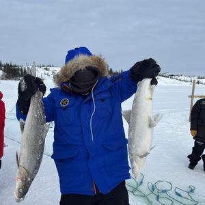 先住民の方がとても詳しく実演をしてくださいました。いろんな種類の魚がたくさん釣れるのが見れます!抱えるのが大変なくらい大きな魚が取れたときは、びっくりしました。大きな魚と記念撮影もできて良かったです!ただ、魚を抱えたときに、手袋や服に結構魚の臭いがついたので、魚を持ちたい人はそこに気をつけた方がいいと思います、、、。実演を見た後に食べた、イエローナイフ で釣れた魚の料理はとても美味しかったです。