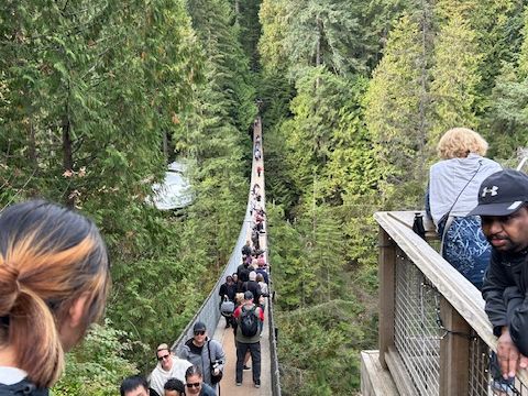 ノースバンクーバーのキャピラノ吊り橋に行きたくて申し込みました。最初ノースバンクーバーに着いた時は雨が降っていて少し寒かったですが、ガイドさんがとても明るい方で常に前向きな言葉をかけてくださったので、私も楽しく参加できました。私は1人で参加したのですが、同日の他の参加者の方々とも交流が出来たのが楽しかったです。移動もありましたが、その間も会話を楽しめました。キャピラノ吊り橋に着く頃には雨もやみ、景色も楽しめました。繁忙期は2時間くらい並ぶところを、雨季に入りかけている今の時期ではすんなり渡れるとのことを聞いて、私自身としては雨が若干降っているけど空いている時期に来れてよかったと思いました。午後はマーケットでご飯を食べたり、お土産をたくさん買うことができました。朝から夕方まで、バンクーバーを満喫できるツアーです。