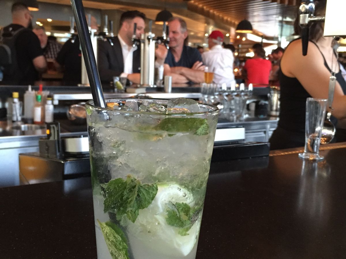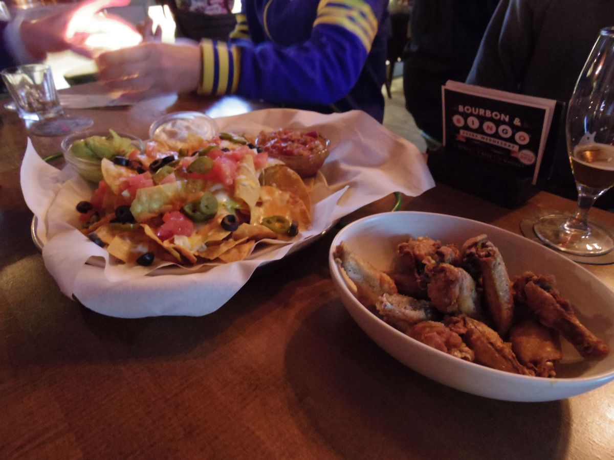 素敵な夜景を横に見ながら歩いて、スポーツパブへ行きました。アメフトやホッケーの画面を前にカウンターで、ビールをチョイス。