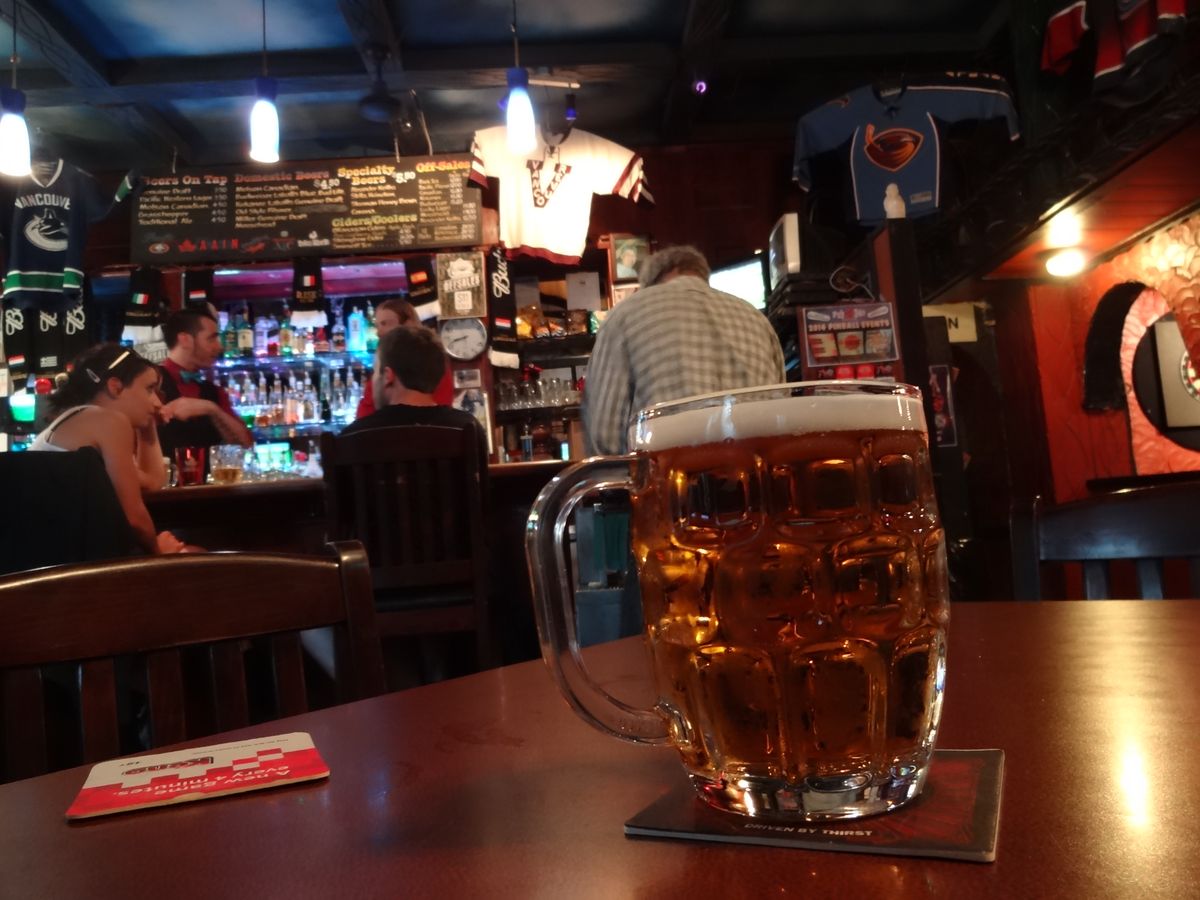 S.O様、ためして実践バンクーバー生活にもご参加して頂いて、パブツアーはいわば打ち上げ的な感じでしたね。どんなお店が良いか伺ってところカジュアルな感じと仰っていたので、ギャスタウン近くのスポーツパブに入店しました。ちょうどNHL(プロアイスホッケーリーグ)のプレイオフ中で地元バンクーバーはレギュラーシーズン敗退で出場していなかったものの、試合をしていたチームが地元チームだったのでしょうか、青年がビール片手に中継に釘付けになっていたのをS.Oさんと人間ウォッチングしていました。