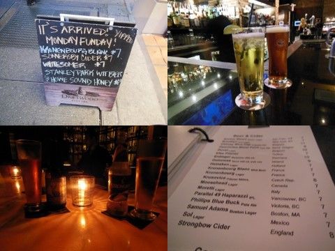元上司・同僚と4人で参加しました。バンクーバー最初の夜におすすめということでしたが、カナダ最後の夜にこのパブ巡りとなりました。ウォーターフロント駅からブロードウェイ駅までスカイトレインに乗って、中心部よりは少しローカルなムードの漂う街で4軒のお店を紹介していただき、内2軒のお店で飲みました。いずれもおしゃれな感じの店でしたが、気取りのない地元の人ばかりで心地よいひとときをすごせました。カナダのビールに始まり、ワイン、ウィスキーとカナダ一色で楽しめました。