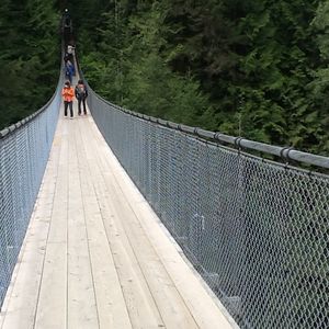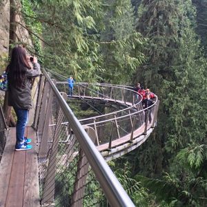 次にキャピラノつり橋へ。高さ70m、長さ137mの吊り橋は、渡るときは激しく揺れて大迫力!吊り橋を渡った後は、木の上の渡り廊下のようなデッキを歩いたり、崖っぷちに突きだすように設置されたデッキを歩いたり、森の中のアトラクションが満喫できます。
