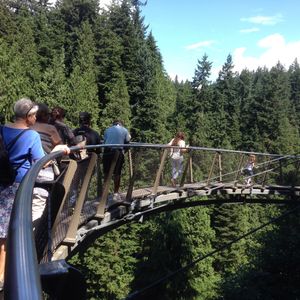 長さ137m、高さ70mのキャピラノ吊り橋は、かなり揺れますが徳島県祖谷の「かずら橋」より安心感を持ちながら渡れます。また、切り立った花崗岩の崖の表面から吊り下げられた歩道クリフウォークからは、すばらしい峡谷を見渡すことが出来ました。そのあとは、サーモンのふ化場を見て、ゴンドラに乗ってバンクーバーの街を見下ろすグラウスマウンテン山頂で素晴らしい大自然の景観を堪能しました。