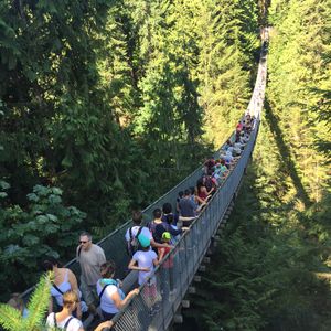 最初、鮭の養殖場に行き、色々な種類の鮭とダムを見学しました。キャピラノ渓谷では1時間半から2時間ほど自由時間があって、吊り橋をわたると、向かいの森の中に作られたアスレチックのようなところがあり、リスになったような気分を味わいました。カナダらしい自然を満喫することができました。昼食は、自由時間の中で各自で済ますことになっていたので、時間を気にせず観光に集中できて楽しかったです。