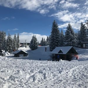 前日夜に雪が降り、ダウンタウンは全く積もっていませんでしたが、ゴンドラに乗って山の上に着いたらサラサラな雪で、太陽も出ていたので雪がキラキラしてとても綺麗な景色でした。
