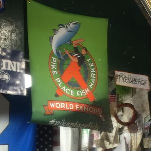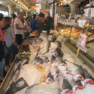 パイクプレイスマーケット、市場内の魚屋さんでは、威勢の良い売り子さんの声が飛び交い、魚も目の前を売り子さんの熟練の技で、あっちからこっちへ。