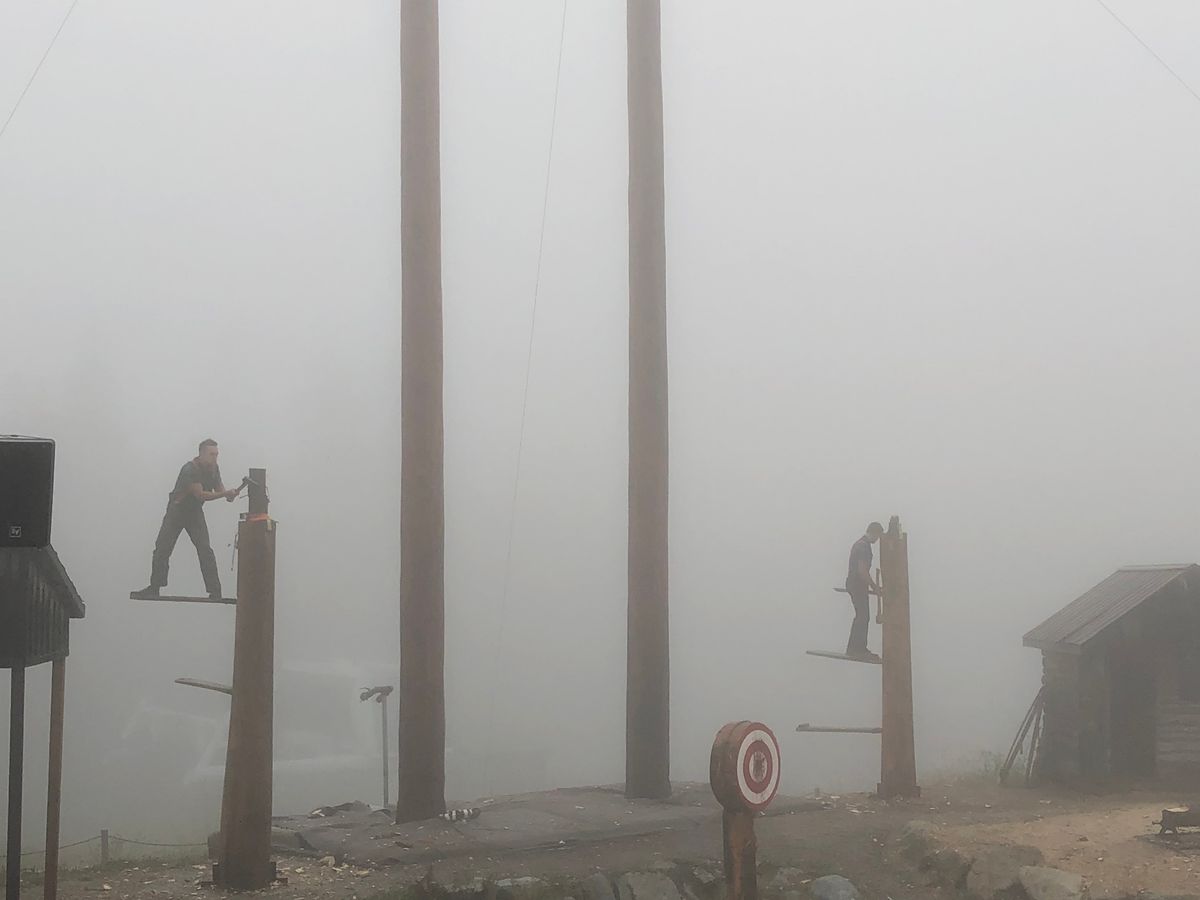 ガイドさんの説明通りに、そこから15分ほど歩くと、エメラルドグリーンの湖が見え、なんてすばらしい眺め。頂上へ上がるリフトがあり乗り込みました。標高が高いので、リフトに乗ると風の冷たさと、高さのために「怖い怖い」と娘は、喜びながら?怖がっていました。右手上には、雲に見え隠れしているつり橋が、真下には白く凍った山壁の氷、すごい!すごすぎる!到着すると、本当に頂上。早速つり橋を渡るが、これが結構ゆれる。でもおもしろい。そしてウィスラーの砦で写真撮影。高い山と同じ高さにいるという感動!雲より上!