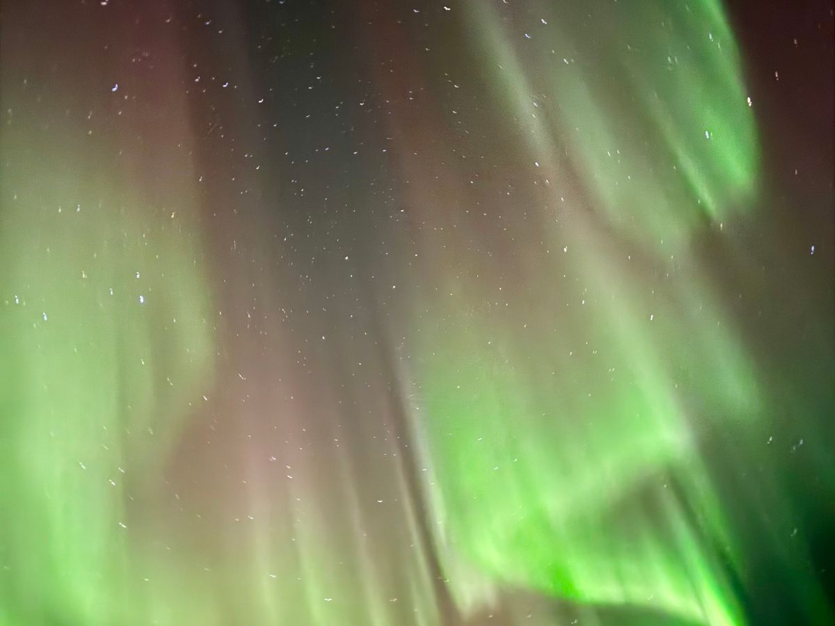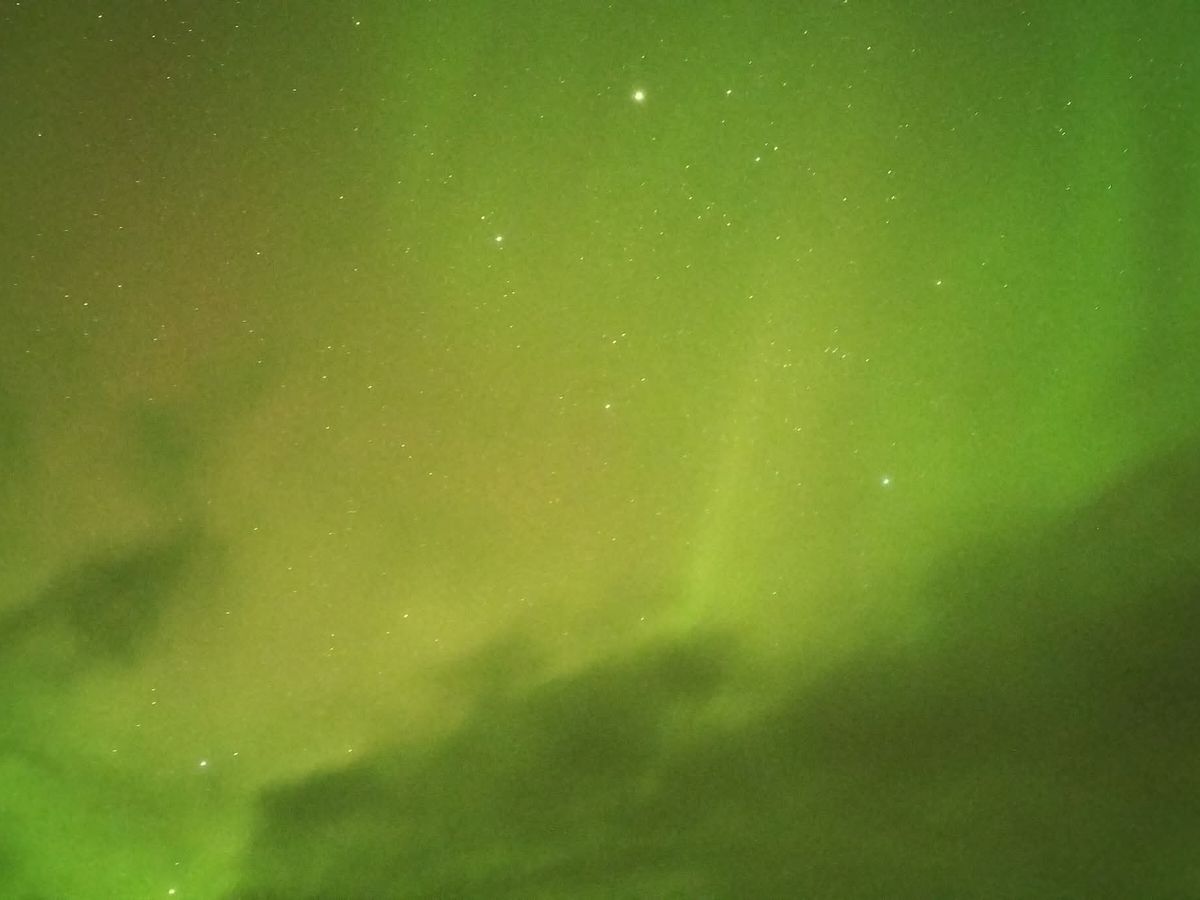 タイトルの通り、肉眼ではボッーと明るいかなと思う程度で、スマホのカメラで撮影してやっとこの程度でした。午前2時まで、マシュマロを焦がしたり、小屋でブラジルのオバチャンと日本語で話したりして楽しかったです。ガイドさんもオーロラが出ると呼びに来てくれるので安心出来ると思いました。