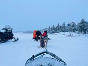 お迎えのバスに乗って到着したら、スノーモービルが牽くソリに乗って出発!(スノーモービルの後部座席に乗れることも) 湖の氷上や小島を超えてゆくので、路面によってアップダウンがあって揺れるので結構スリリングです。動画に収めるのなら落下防止対策をとっておきましょう。 運が良ければ木々の合間にライチョウや、キツネなど野生生物を見ることもできますよ。 漁のポイントへ着いたら実演開始!氷に穴を開けて、仕掛けて