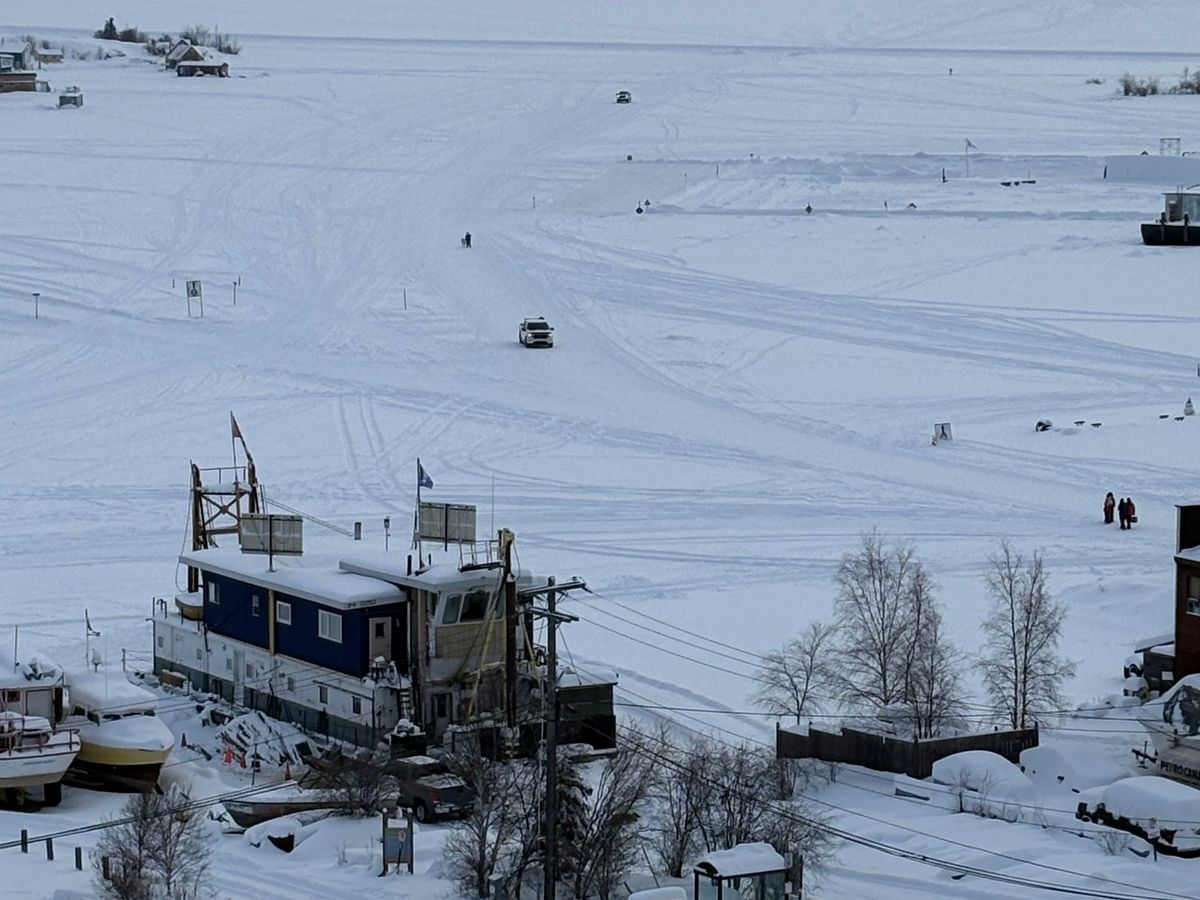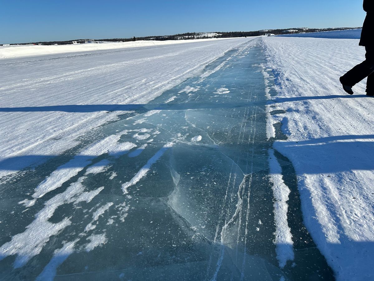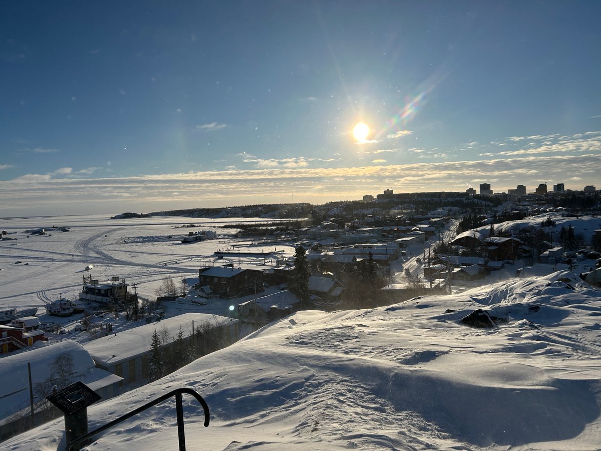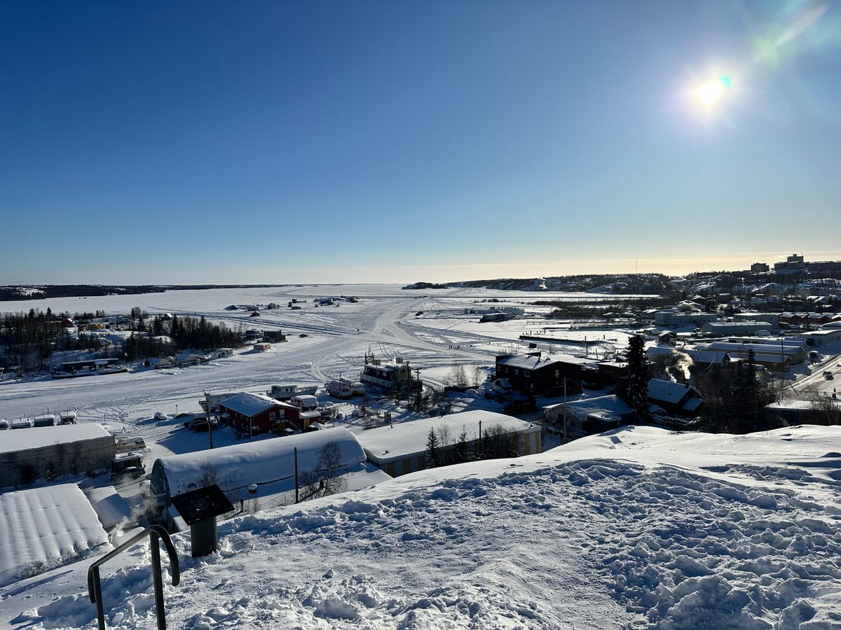 次はモニュメントがある丘の上へ。イエローナイフや湖が一望できます。遠くまでアイスロードが続いているのが見えます。ただ、丘の上へ行く階段はとっても滑りやすいので注意です!グループの半分くらいの人が滑って転んでいました。