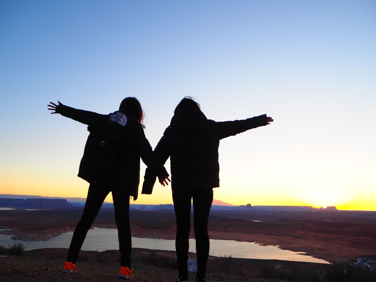 朝7:30くらいに最初の目的地にパウエル湖に到着。眺めは最高です!ガイドさんたちが写真も撮ってくれます!