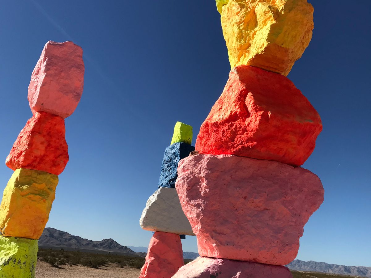 砂漠の中にカラフルなアートがあり、一際目立ちます。実際は岩⁈に色を塗っている、ような感じで目をひく鮮やかさです。