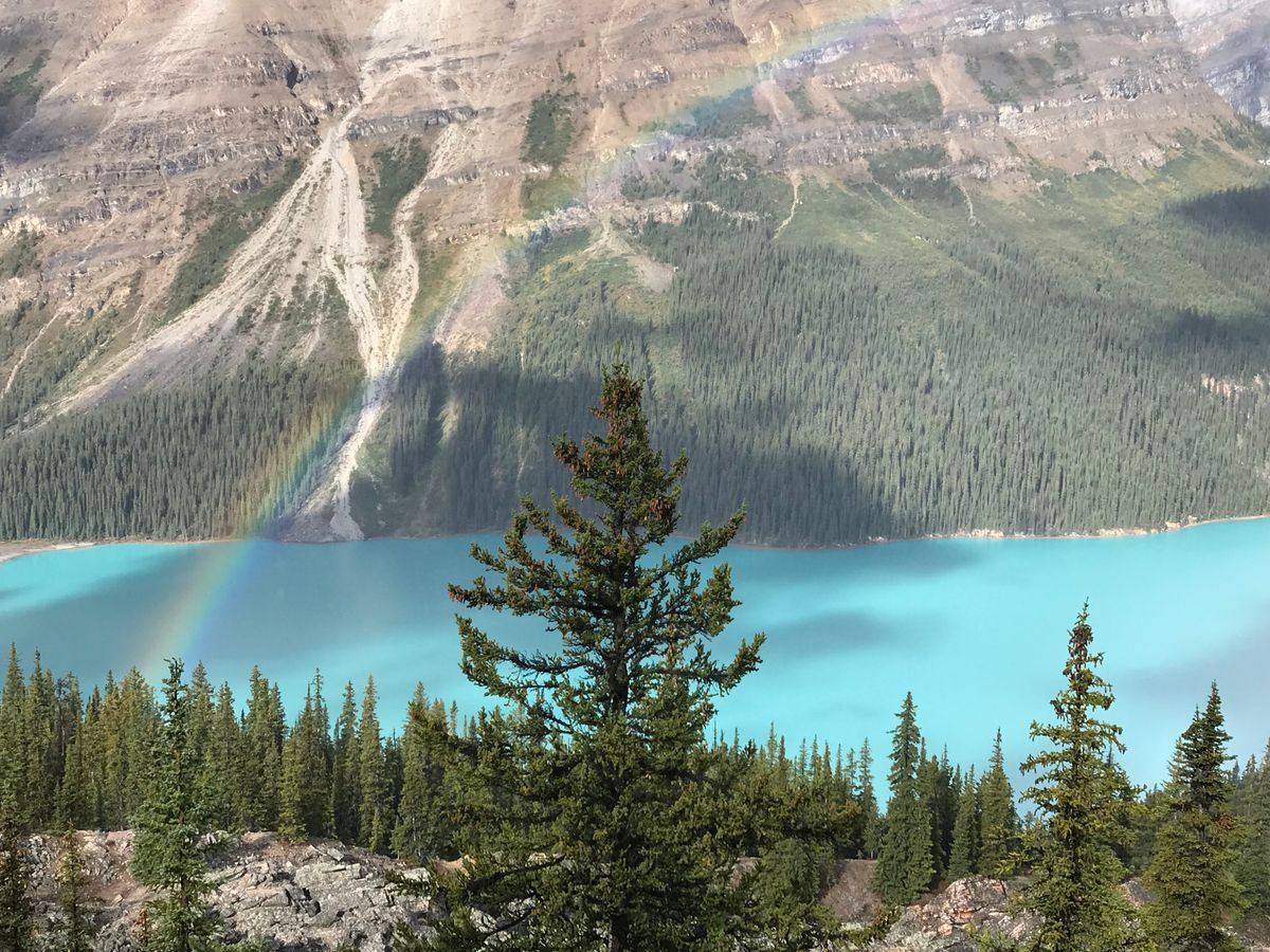 途中で雨に降られましたが、山の天気は変わりやすくすぐに晴れ間が見え始め、おかげでカナディアンロッキーに架かる虹を見る事が出来ました!!