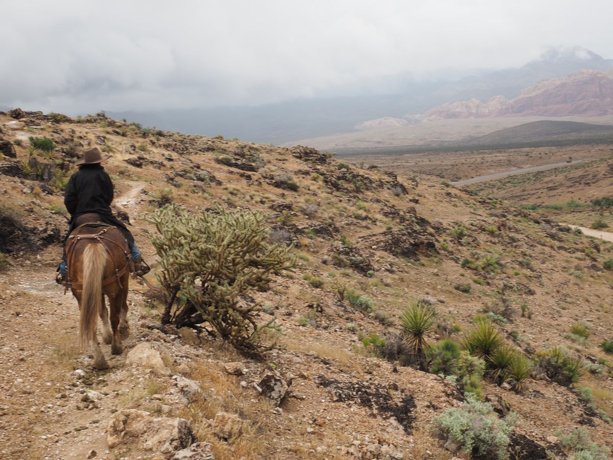 ラスベガスから車で30分程のレッドロックキャニオンにある牧場からトレイルを乗馬で2時間散策します。あいにく途中から雨になり、季節はずれの寒さもあって最後のほうには少々つらくなりましたが、馬たちは道草することもほとんどなく、自動運転で進んでくれました。山の高台のところでインストラクターが馬から降りて各参加者と馬の写真を撮ってくれました。天気がよかったらもっとすばらしい絶景を望めたかと思いますが乗馬は楽しかったです。インストラクターの説明(英語)が少々早口で(アメリカ人でさえも、もっとゆっくり説明してくれと頼んでいた)、最初不安もありましたが馬たちがお利口なので乗馬中は問題ありませんでした。