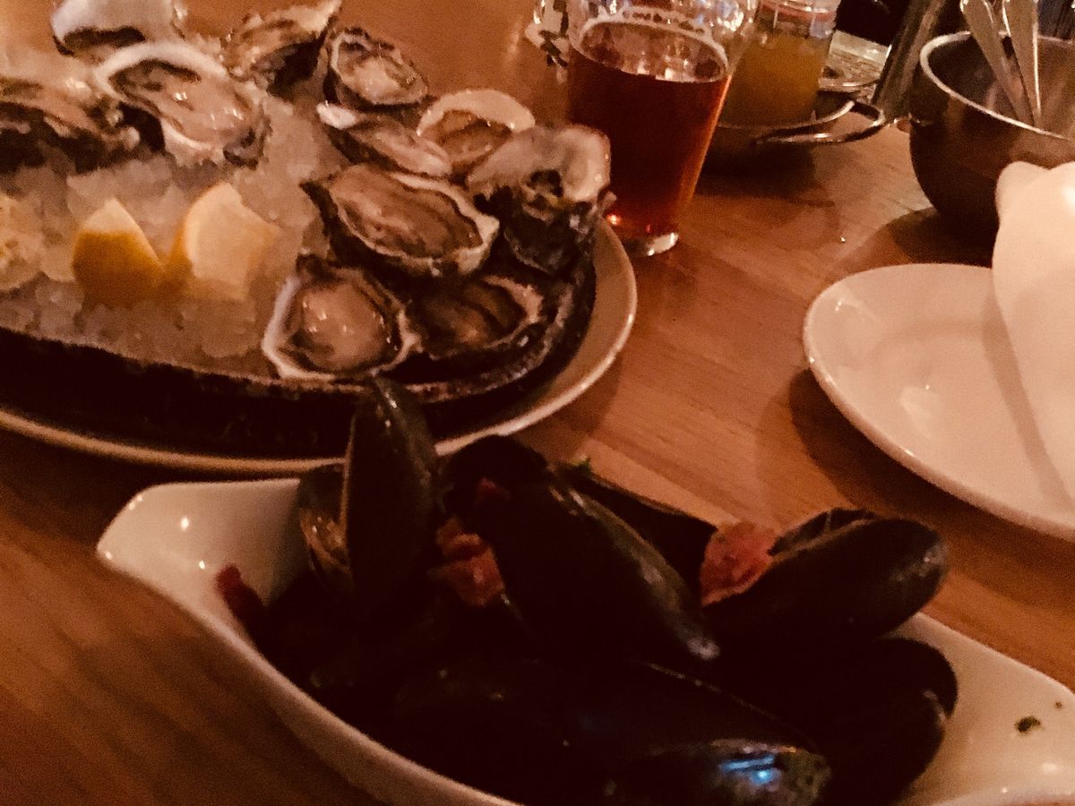 お腹が空いていたので、一軒目は地元産のオイスターが食べられるイエールタウンのお店に連れて行って頂きました。旨味がたっぷり詰まったオイスター3種類とムール貝を堪能!