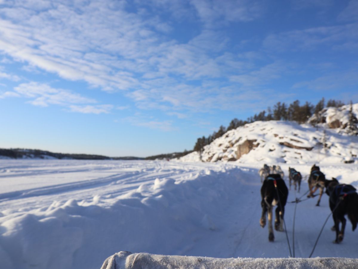 脚を無理矢理ソリの中に押し込まれる程、ソリはゆとりがありませんが、犬ぞりのペースは風が気持ち良く感じられるくらいの適度なスピードで楽しかったです。ゴーグルが必要との口コミを拝見していたので前から吹き付ける氷を心配したのですが、ソリの最前に乗って一眼レフカメラを構える余裕はありました。